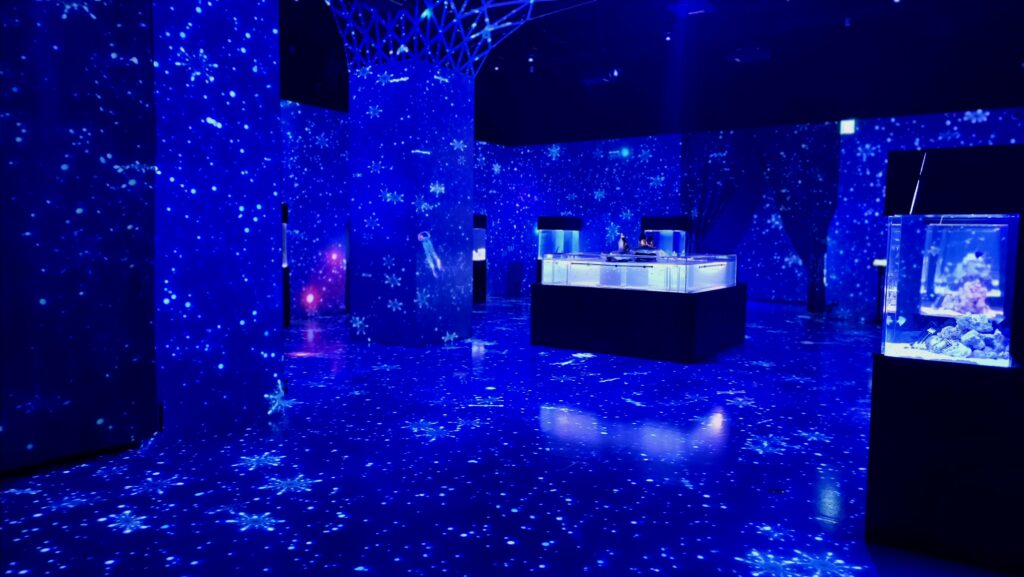 館内を進むと出会う「MARINE SNOW DOME」は、雪の結晶が降り積もる海中世界を表現したエリアです。フロア一面に並ぶ多数の小型水槽では、色とりどりの小さな魚たちがまるで舞い散る雪のように泳ぎ回り、キラキラとした光景を作り出しています。壁や天井にはオーロラのようなカラフルな光や雪の結晶が映し出され、足元からはクリスタルが煌めく神秘的な空間になっています。壁面にはインタラクティブな仕掛けがあり、映し出されている雪の結晶に手をかざすと、虹色の光をまとった生きものの映像がふっと現れる演出もあります。子供たちが一生懸命に結晶を探してタッチしていましたよ(笑)